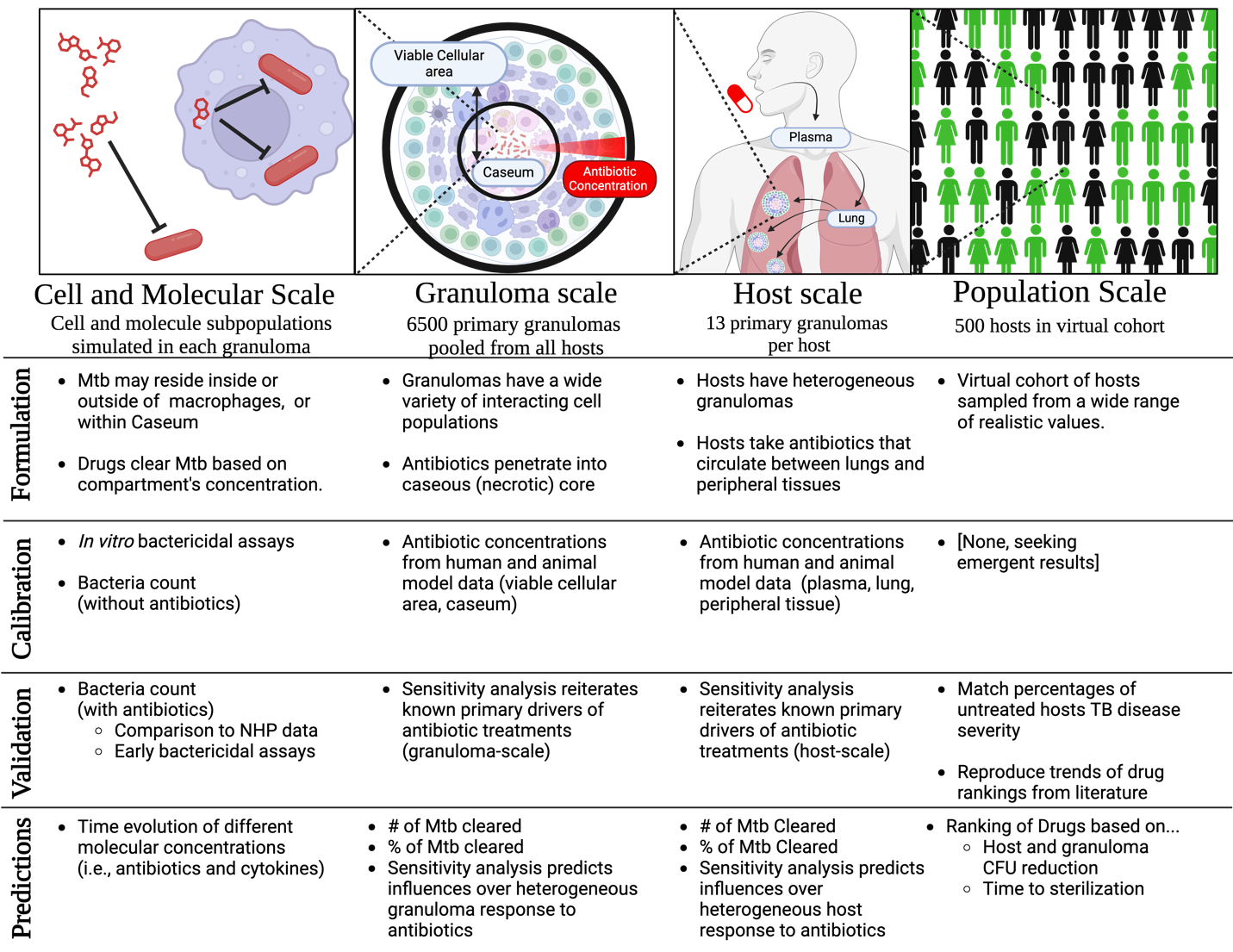 Overview: A core challenge in studying pulmonary tuberculosis or its treatment is heterogeneity. Multiple granulomas, complex and often treatment-resistant immune structures, form in the lungs of hosts infected with pulmonary Mtb. A single host will have multiple granulomas, and each granuloma within that host will have distinct dynamics. Moreover, we see differences in TB progression between hosts as well. For this, we have developed HostSim, a multi-scale whole-host model of Mtb infection. While the paper associated with this webpage details the implementation of drug treatment of antibiotic-susceptible Mtb infection, there are a plethora of cellular and molecular interactions that underpin granuloma foundation, maturation, and dissemination - each represented by equations or inter-compartmental exchanges detailed in this online appendix. Each of these mechanisms is also parameterized, and our parameter ranges are also found in this digital appendix. |